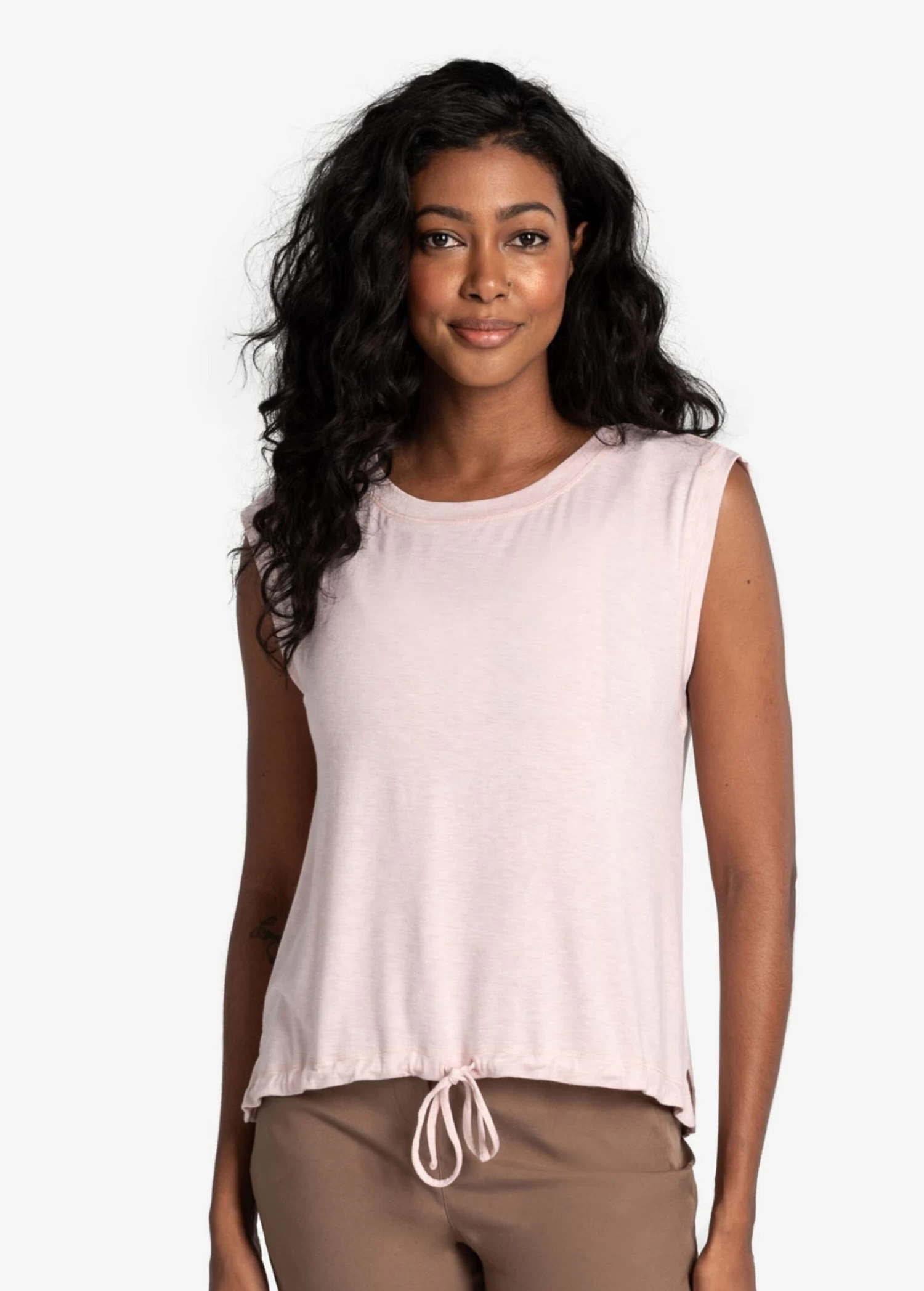 Your everyday ultra soft t-shirt with a twist. The Elisa short sleeve is made with Modal by TENCELâ„¢ natural fibers. The breathable, lightweight sleeveless silhouette has a soft brushed handfeel, drawstring at the front hem for extra adjustment and side slits at shirt base.
